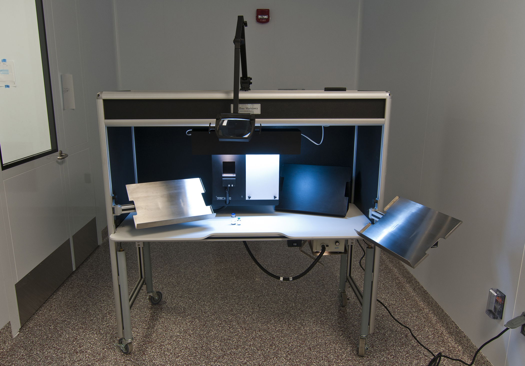 Manual inspection hood, a system for particulate inspection of liquid-filled vials and ampoules. Photo taken at the Advanced Technology Research Facility (ATRF) at the Frederick National Laboratory for Cancer Research, National Cancer Institute.